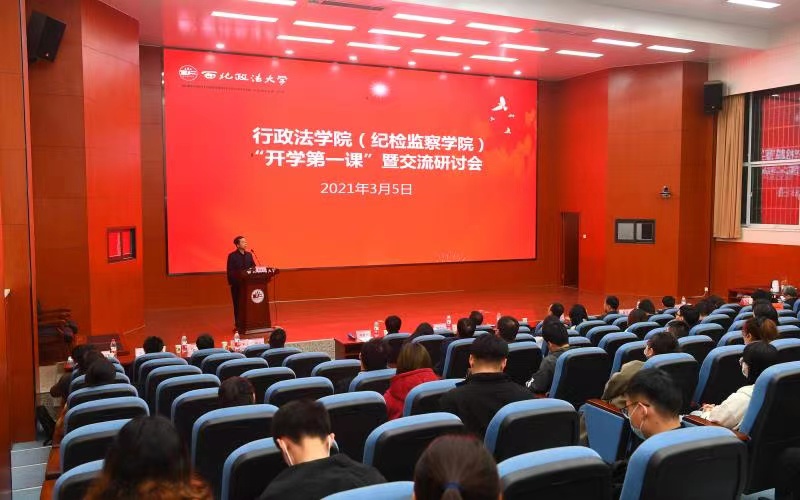 3月5日,行政法学院(纪检监察学院)“开学第一课”暨交流研讨会在雁塔校区人权研究院报告厅举行。省纪委监委办公厅主任邓峰彬、政策法规研究室主任樊彬、案件审理室主任马红梅,省自然资源执法局局长陶虎生,西安市纪委监委案件审理室主任杨全,校党委副书记、纪委书记、监察专员肖道远出席活动。行政法学院(纪检监察学院)全体教师和研究生100余人参加了此次活动。