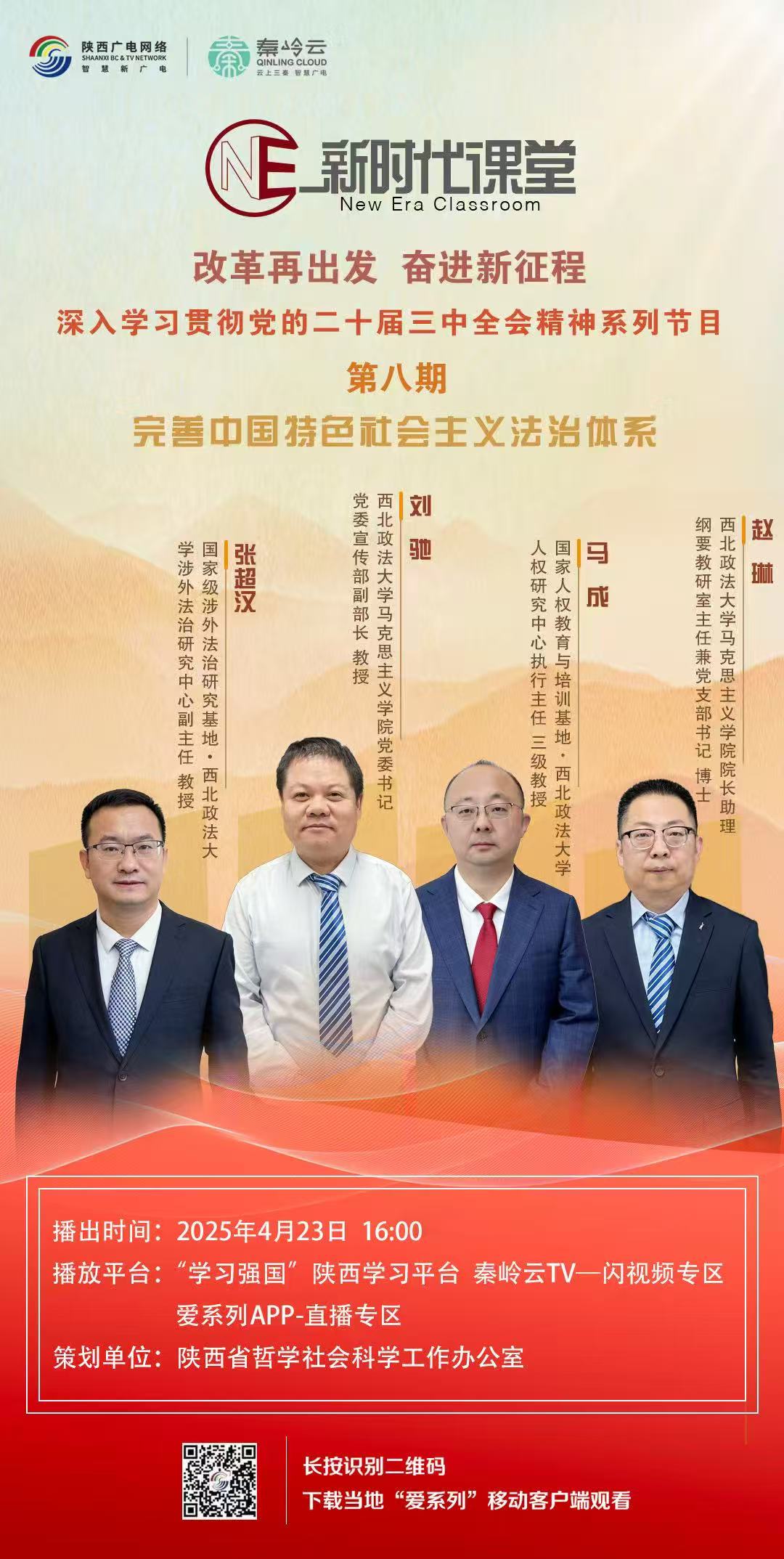 受省委宣传部委托,由陕西省哲学社会科学工作办公室策划,陕西广电网络传媒(集团)股份有限公司制作,ac米兰刘驰教授、马成教授、张超汉教授和赵琳博士共同录制的“深入学习贯彻党的二十届三中全会精神”系列融媒体电视理论宣讲节目《新时代课堂》第八期:完善中国特色社会主义法治体系在“学习强国”陕西学习平台、秦岭云TV—闪视频专区、爱系列APP—直播专区播出。(播出网址为:http://qinling.juyun.tv/live.php?id=173461)