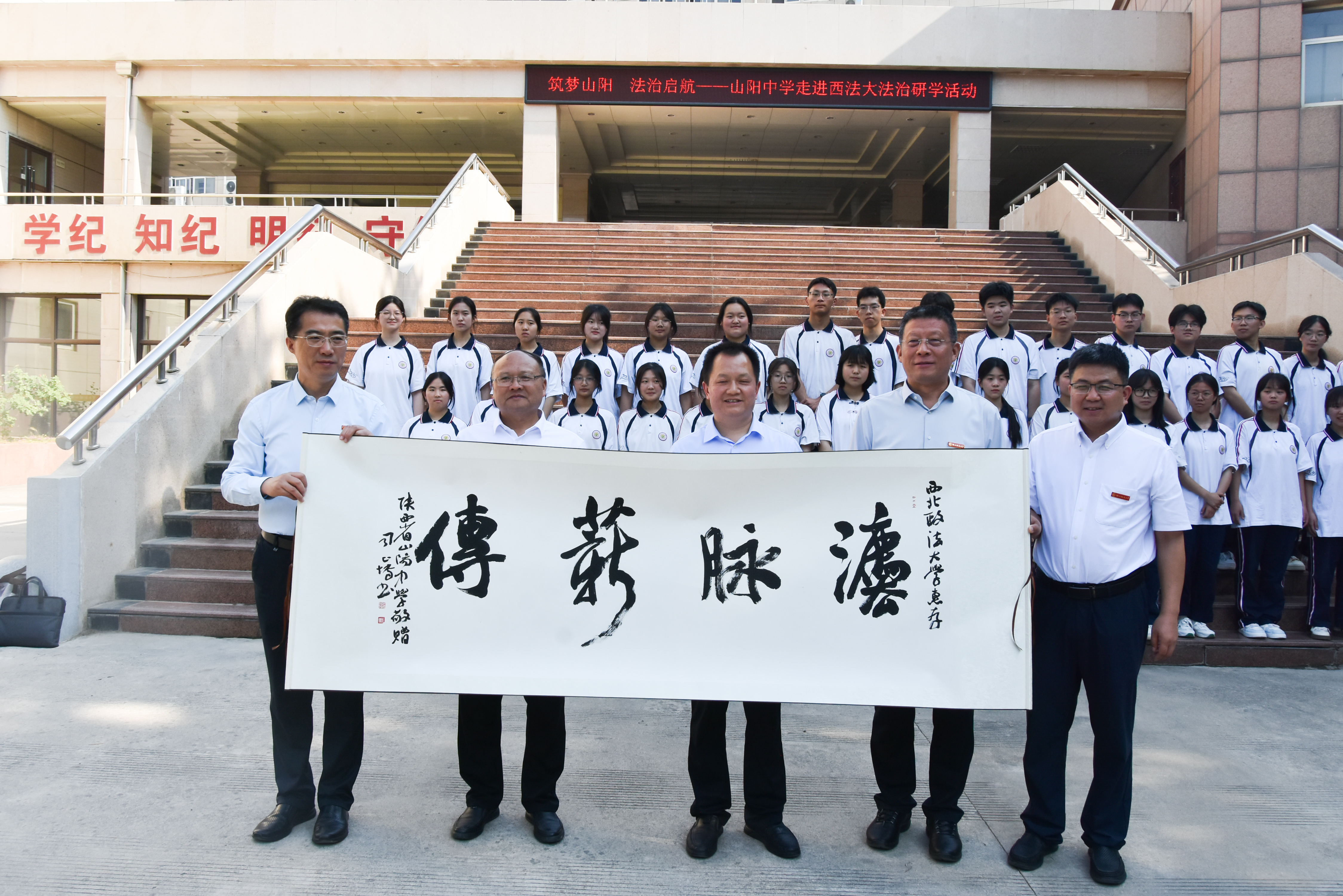 图书馆前,学校党委书记赵万东、副书记张军政热情接待来自山阳中学的师生代表,并向他们赠送了学校资深教授、陕西省前社科联主席赵馥洁先生的著作,同时为“小客人”准备了学习用品和精美礼物。山阳中学副校长虞华林向学校回赠了一幅由该校教师精心书写的“法脉薪传”墨宝以示敬意,孩子们也向赵万东老师赠送了精心制作的手工艺品以示感激。赵万东向“小客人”表达了由衷的感谢,并热情邀请他们报考ac米兰官网中文网站,“希望能够让研学活动中播撒下的法治理想种子绽放出绚烂的花朵,期待与大家的再次相聚。”