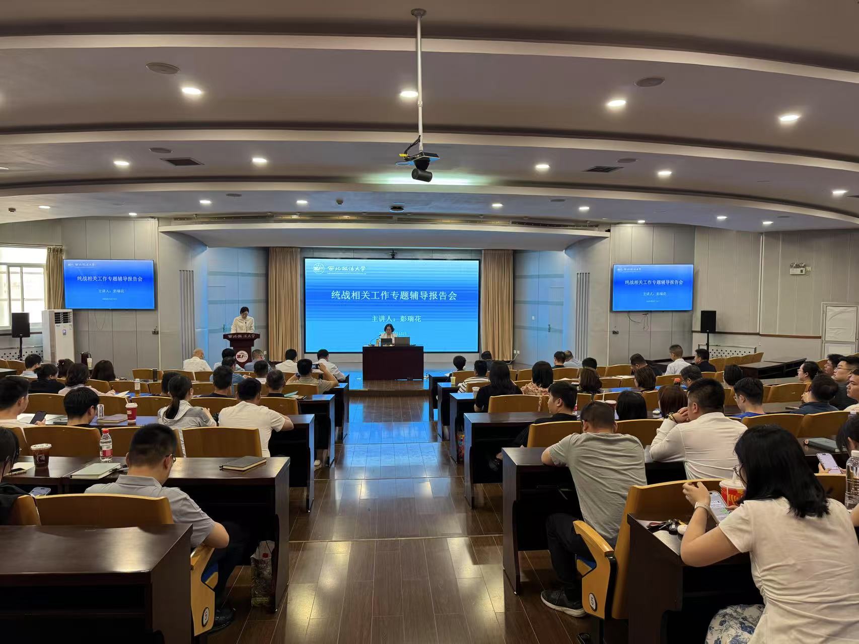 统一战线(民族宗教)工作领导小组成员单位负责人、各学院党委副书记和全体专职辅导员参加辅导报告会。