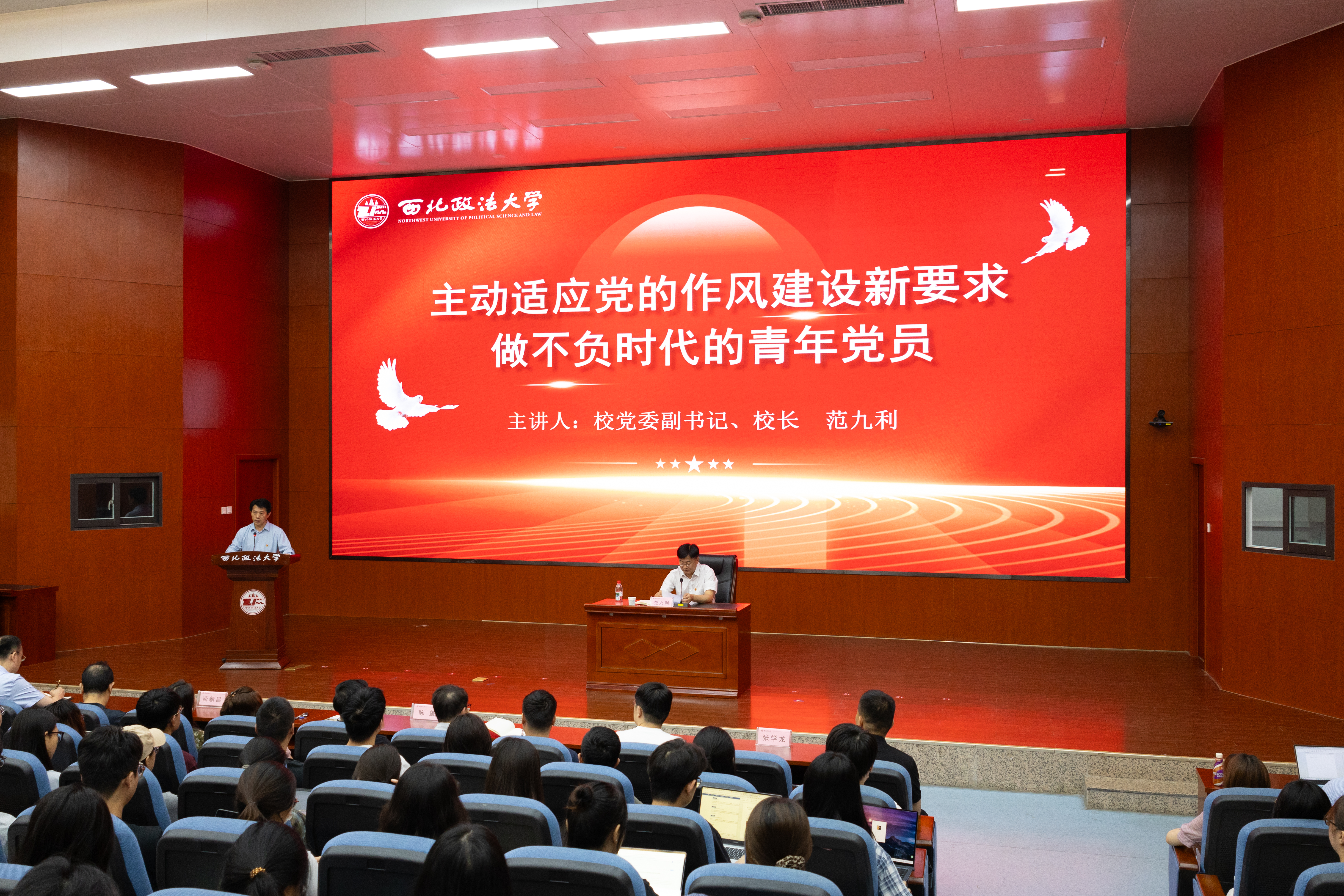 6月18日,校党委副书记、校长范九利在雁塔校区人权报告厅为法治学院 法律硕士教育学院师生党员和入党积极分子讲授题为“主动适应党的作风建设新要求,做不负时代的青年党员”专题党课。学院领导班子、全体行政干部、学生党员及入党积极分子代表共200余人参加党课学习。