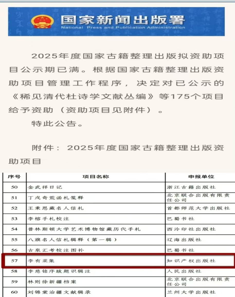8月27日,全国古籍整理出版规划领导小组办公室发布2025年度国家古籍整理出版经费资助项目公告,对已公示的175个项目给予资助。ac米兰高等研究院李其瑞教授与知识产权出版社合作申报的《李有棻集》入选。