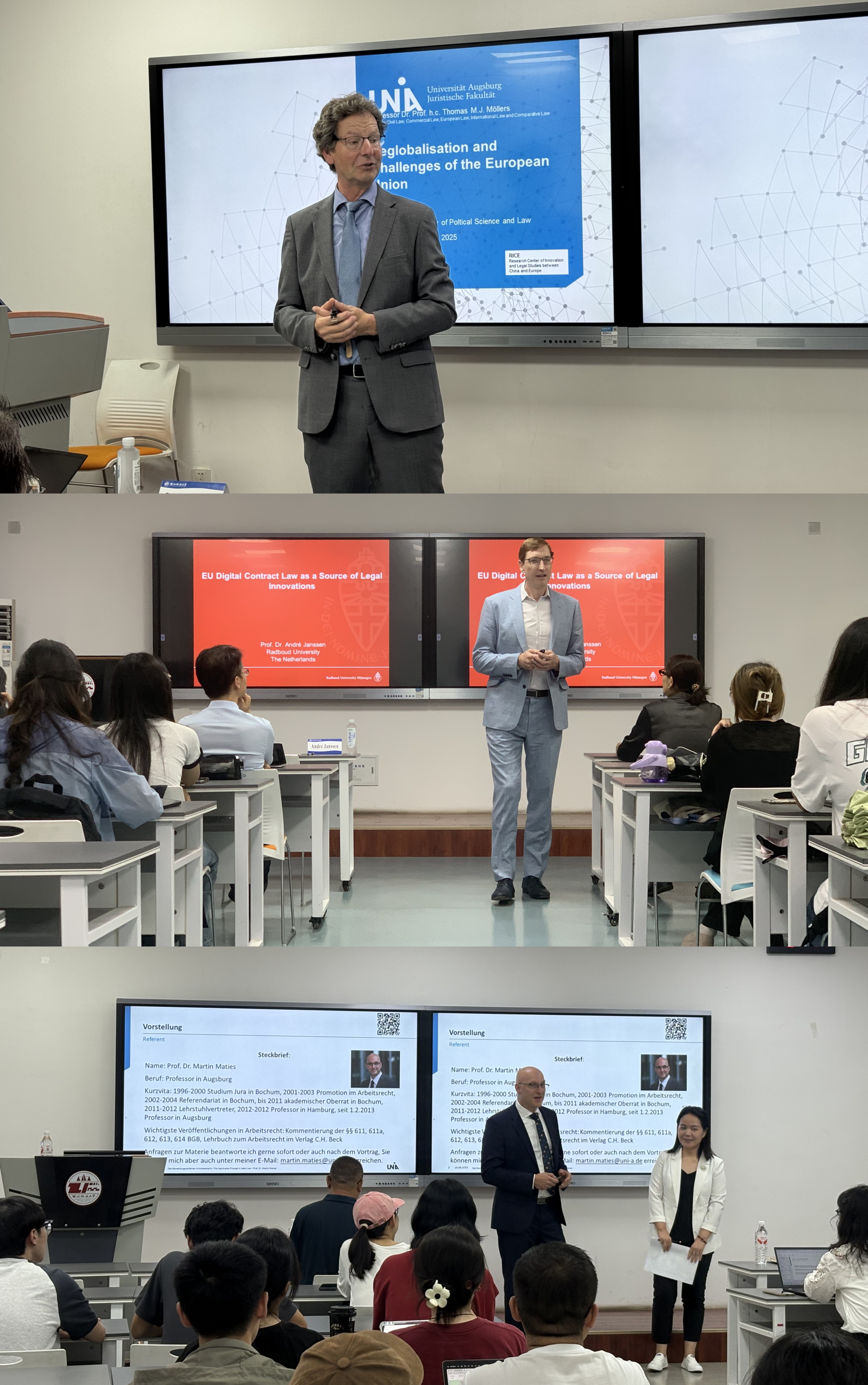座谈后,托马斯・默勒斯教授一行分别前往国际法学院(国际仲裁学院)和经济法学院(知识产权学院)开展“欧盟去国际化与其他挑战”“法律创新来源:欧盟数字合同法”“欧盟劳动法与社会保障”等三场法学专题讲座,与ac米兰师生围绕中外法学热点研究问题进行深入探讨,取得积极交流成效。