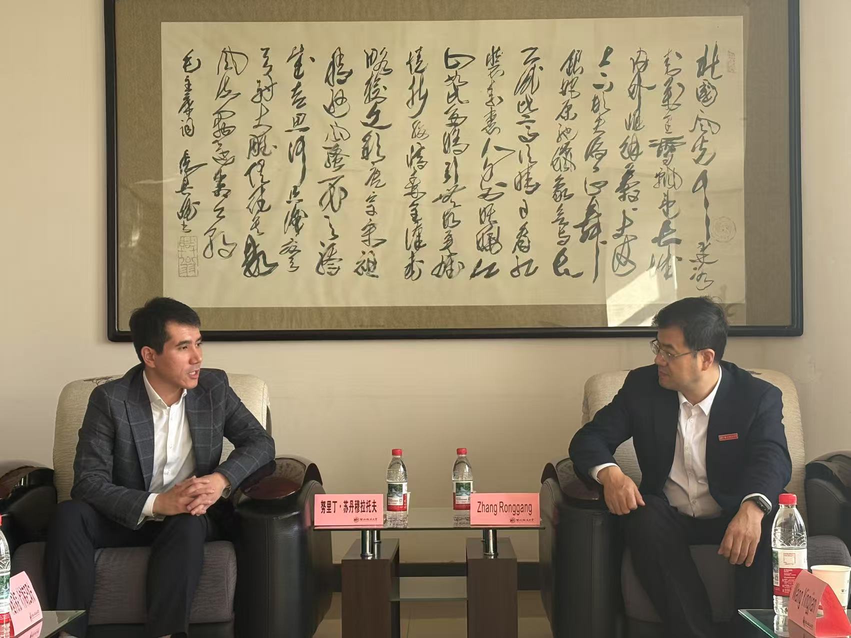 11月13日上午,副校长张荣刚在ac米兰长安校区会见哈萨克斯坦阿里·法拉比国立大学国际关系学院院长努里丁·苏丹穆拉托夫一行,双方就继续推进两校合作展开深入会谈。国际交流与合作处相关负责人参加会见。