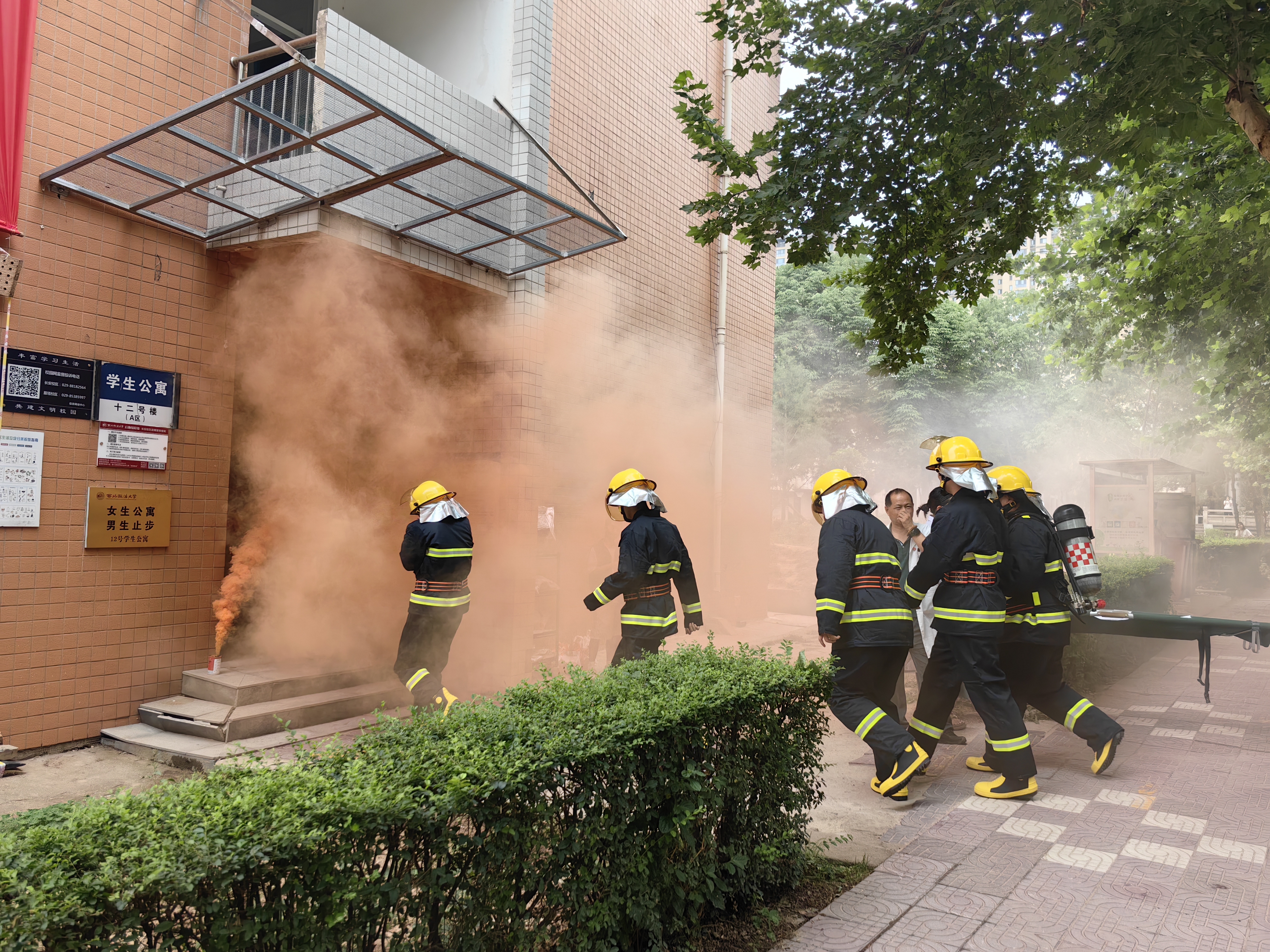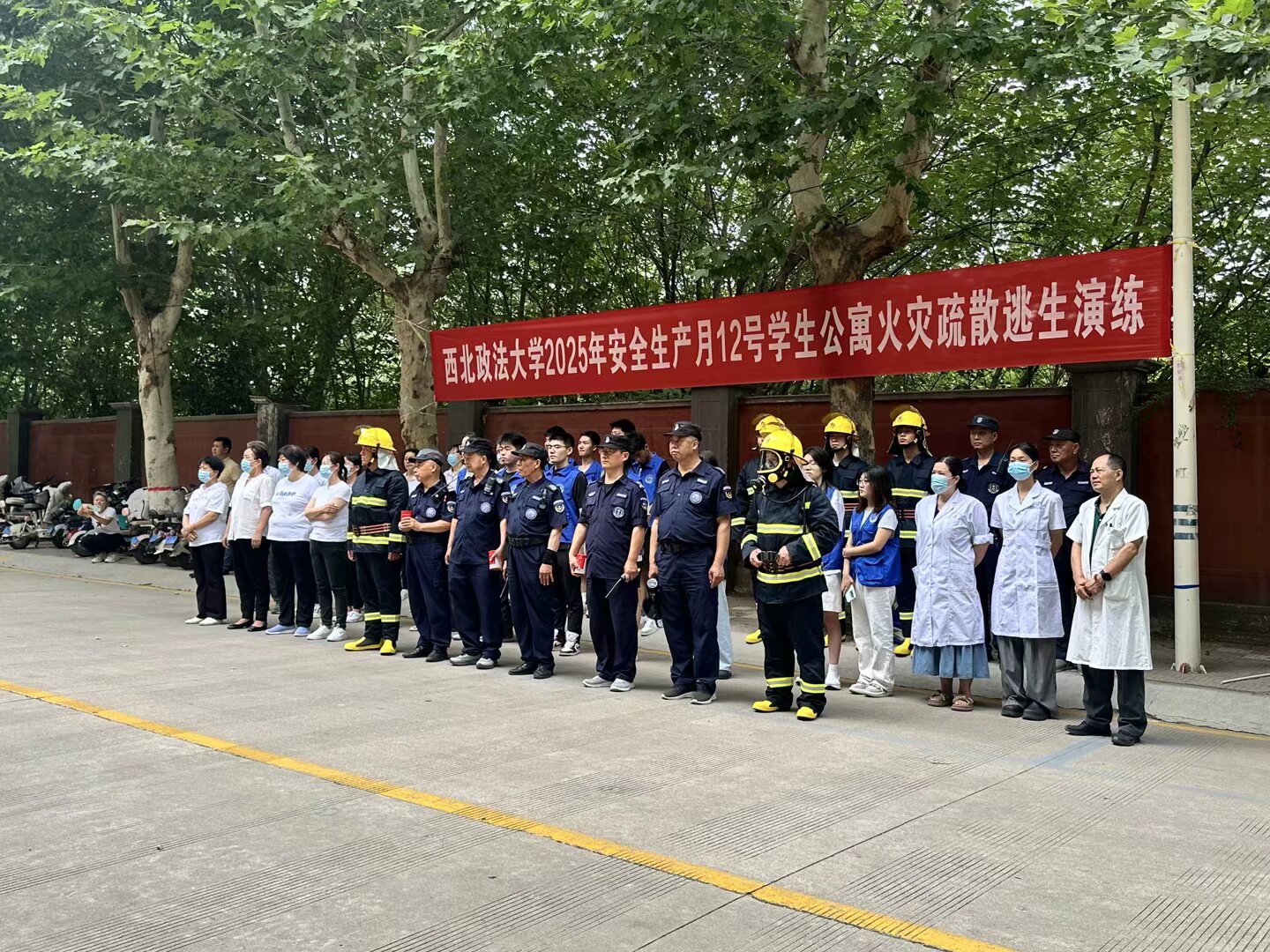 6月19日,保卫处联合学工部、后勤保障处、相关学院及门诊部,于长安校区12号学生公寓组织开展2025年“安全生产月”消防疏散演练。校党委副书记郭武军到现场指导。800余名学生、15名辅导员及50余名后勤宿管人员参与本次演练。在初期火灾扑灭及应急疏散演练过程中,指挥中心协同配合,迅速抵达现场开展救援。宿舍管理员组织公寓学生采用弯腰靠墙、捂住口鼻的标准姿势迅速撤离。整个演练流程紧凑、内容详实,覆盖多类人员,切实增强学生应对突发火情的应急处置能力。