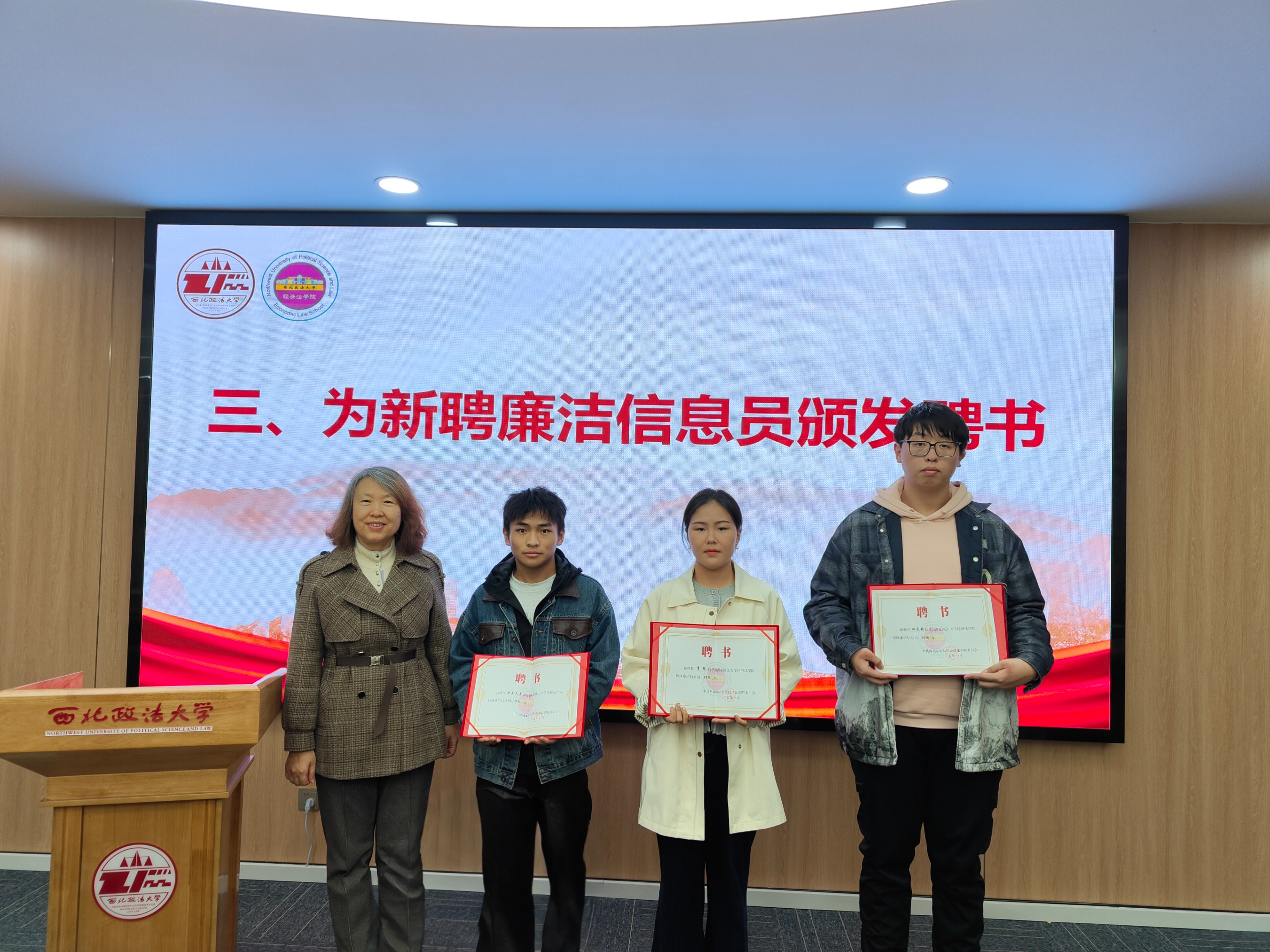 李建梅为学院新聘校风廉洁信息员颁发聘书,经济法学院党委副书记、副院长李恒宣读了学校第六届“廉洁文化宣传教育月”活动实施方案。