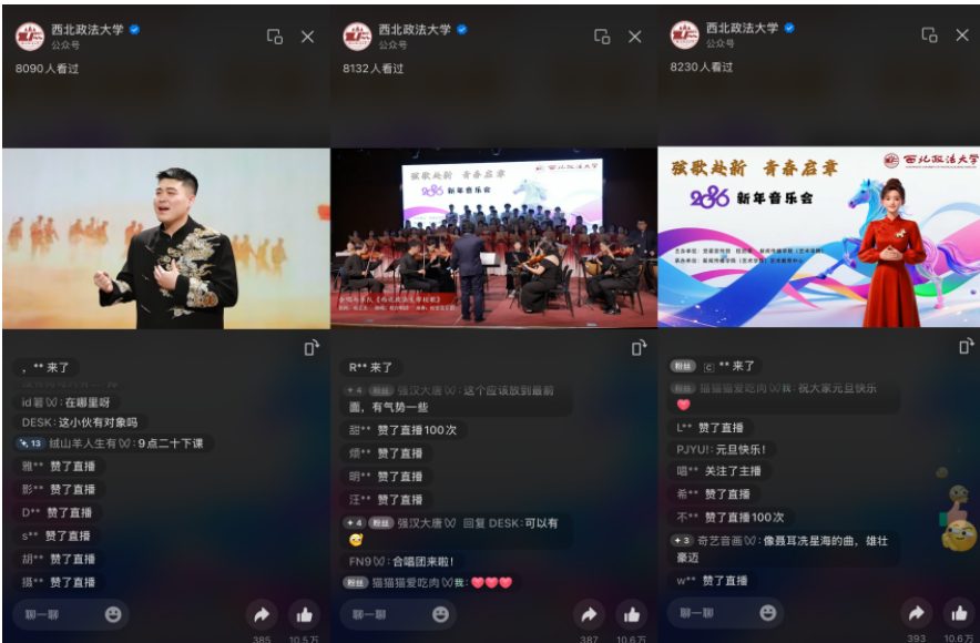 弦歌悠扬辞旧岁,青春激昂启新程。12月31日晚19:50,ac米兰官网中文网站“弦歌赴新,青春启章”2026新年音乐会通过官方视频号线上直播圆满举行。本场音乐会由党委宣传部、校团委、新闻传播学院(艺术学院)联合主办,新闻传播学院(艺术学院)艺术教育中心承办,数字主持人“法小新”再度亮相,向全校师生、广大校友致以诚挚的新年祝福。新年音乐会为观众呈现了一场精彩纷呈的视听盛宴,共8200余人在线观看,收获点赞10万次,温情与暖意跨越屏幕传递。