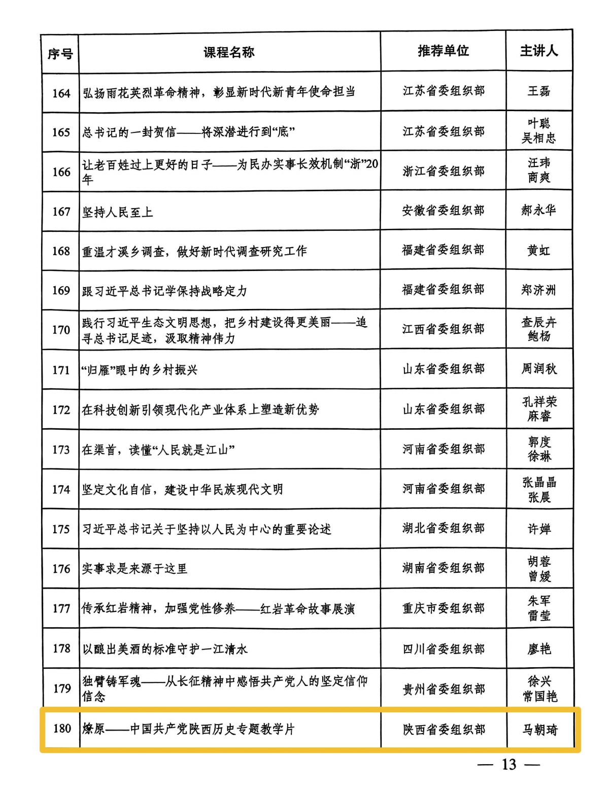 近日,中共中央组织部办公厅印发了《全国干部教育培训好课程推荐目录的通知》(组厅字〔2024〕40号),由陕西干部网络学院和西安教育融媒体中心(西安教育电视台)联合制作,经陕西省委组织部推荐,ac米兰副校长、二级教授马朝琦撰稿的九集专题教学片《燎原-中国共产党陕西历史》获全国干部教育培训好课程。