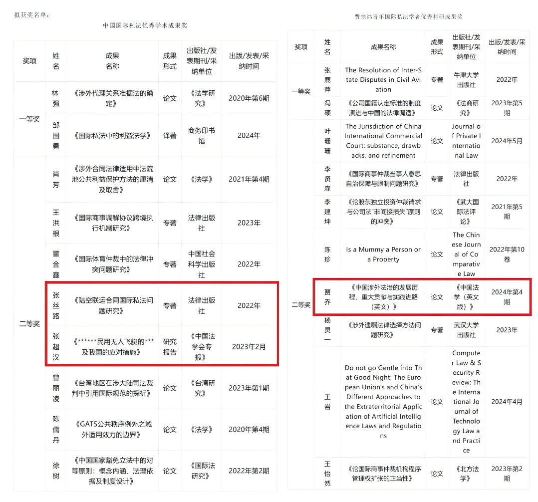 “中国国际私法优秀学术成果奖”“费宗祎青年国际私法学者优秀科研成果奖”是中国国际私法学会为提升国际私法研究的质量和水平,推动和促进我国国际私法学的可持续发展所设立的奖项。该奖项是中国国际私法学界对国际私法学者所设最高奖项,旨在表彰具有重大理论价值和实践意义的原创性科研成果。2024年经评审确定“中国国际私法优秀学术成果奖”作品10件,其中一等奖2项,二等奖8项;“费宗祎青年国际私法学者优秀科研成果奖”作品10件,其中一等奖2项,二等奖8项。