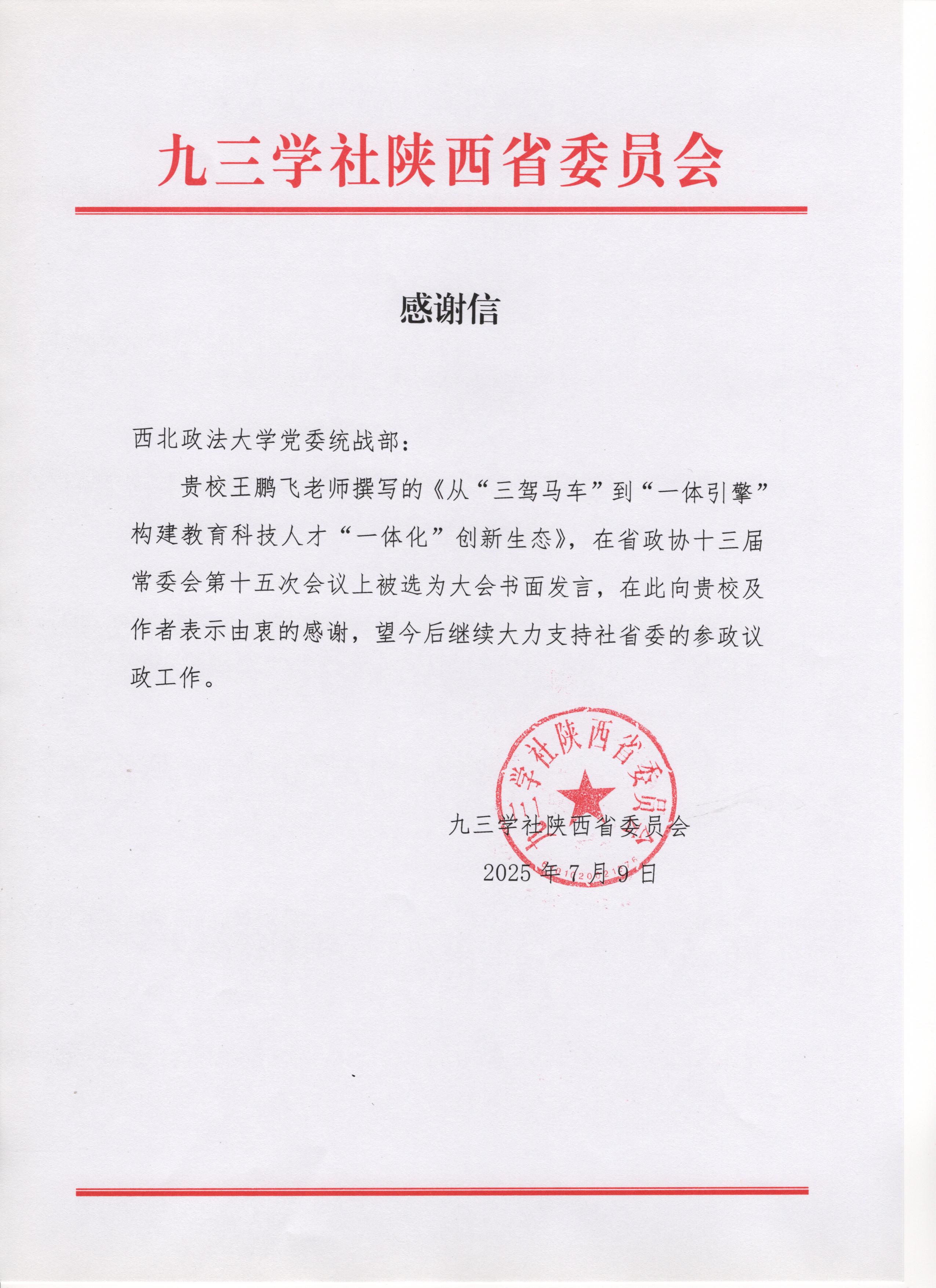 近日,九三学社ac米兰官网中文网站支社主委王鹏飞撰写的文章《从“三驾马车”到“一体引擎”构建教育科技人才“一体化”创新生态》在省政协十三届常委会第十五次会议上被选为大会书面发言,九三学社陕西省委员会向党委统战部发来感谢信,并希望今后继续支持社省委的参政议政工作。