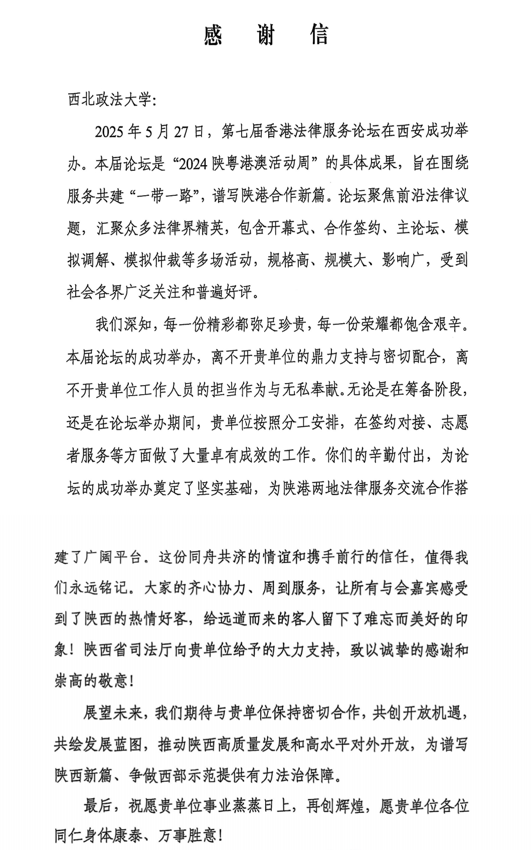 日前,ac米兰收到陕西省司法厅发来的感谢信,高度评价ac米兰为第七届香港法律服务论坛成功举办做出的积极贡献,并致以诚挚谢意。信中特别肯定了ac米兰在签约对接、志愿者服务等方面的突出表现,赞扬工作人员展现了担当作为与无私奉献精神,为论坛的成功举办奠定了坚实基础,为陕港两地法律服务交流合作搭建了广阔平台。