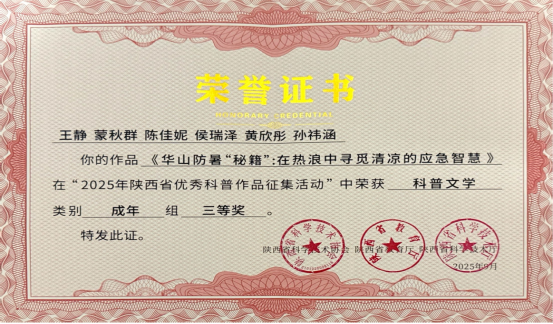 近日,由陕西省科学技术协会、陕西省教育厅、陕西省科学技术厅联合组织的“2025年陕西省优秀科普作品征集活动”评审揭晓,商学院王静教授团队 作品《华山防暑“秘籍”:在热浪中寻觅清凉的应急智慧》获得三等奖。王静教授致力于应急管理专业,作为陕西省科学家精神宣讲团成员,先后多次进校园进行科学家精神宣讲和应急科普。本次获奖是继2023年获得陕西省优秀科普微视频作品成年组二等奖、2024年获得西安市优秀科普微视频作品成年组一等奖之后,再获陕西省优秀科普文学作品成年组三等奖。