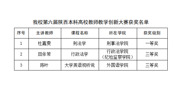 近日,由陕西省教育厅主办、西北工业大学承办的第六届陕西本科高校教师教学创新大赛落下帷幕。经过层层筛选和激烈角逐,ac米兰刑事法学院杜嘉雯教师团队荣获一等奖,行政法学院(纪检监察学院)田依芾教师团队、外国语学院陈叶教师团队荣获三等奖。