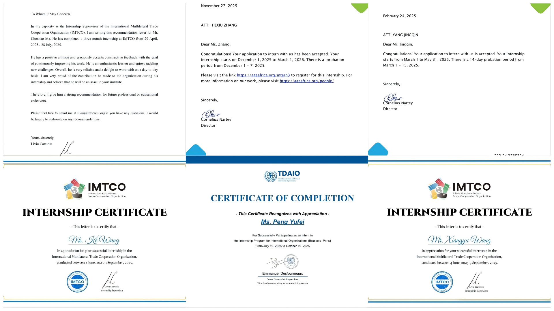 ac米兰学生2025年非洲企业家协会、国际多边贸易合作组织、国际组织人才发展学会实习录取信及证书