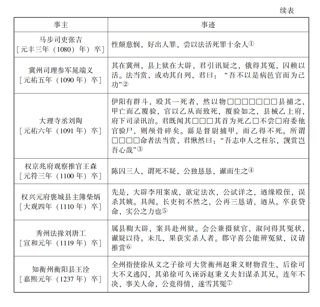 显而易见,雪活酬赏目的在于通过官吏详察案情,达到消除冤狱、慎刑止杀的目的。雪活人命被视为官僚重要德政治迹,部分雪活事例得以著于史籍、墓志之中(参阅表1《墓志所见宋代雪活案例简表》)。譬如,任颛[治平四年(1067年)卒]通判汝州,“州有大狱刘来福者,公至,为辨不当死者二人。”绍圣初年,乔执中以宝文阁待制知郓州,“执中宽厚有仁心,屡典刑狱,雪活以百数。”名臣范百禄之子范祖述“监颖州酒税,摄狱掾,阅具狱,活两死囚,州人以为神。”依据宋代司法惯例,雪活人命者应获得朝廷奖赏,与此同时,原审法官应承担相应法律责任。由此,针对雪活酬赏,出现庸吏滥用和良吏弃用两项截然对立的司法倾向。