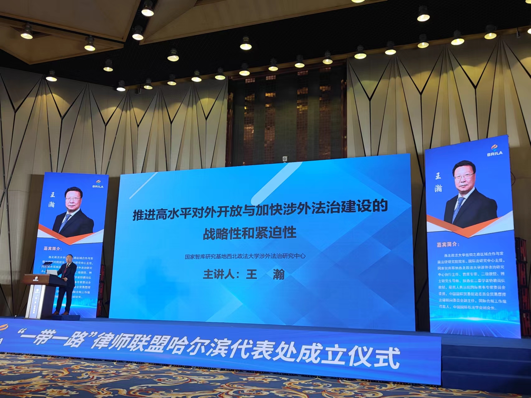 最高人民法院国际商事专家委员会委员、国家级涉外法治研究中心执行主任王瀚教授应黑龙江省律师协会特别邀请出席成立仪式,并作“推进高水平对外开放与加快涉外法治建设的战略性和紧迫性”的主题演讲,就高水平对外开放的内涵及其与涉外法治之间的交互影响和互动关系,当前我国制度型对外开放的外部环境与涉外法治建设面临的突出问题,我国涉外法律服务业的发展现状、存在问题及其体制改革和制度建设等问题进行阐释。