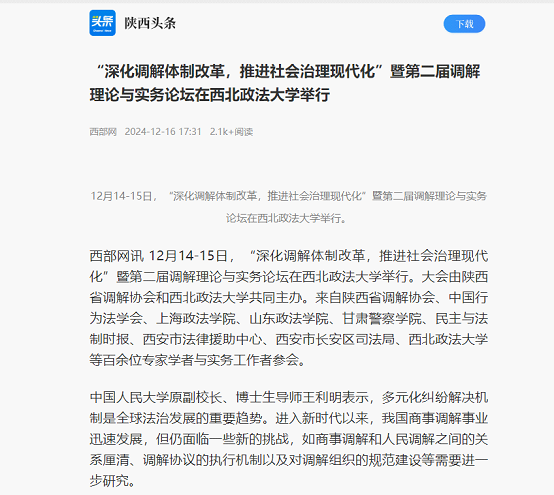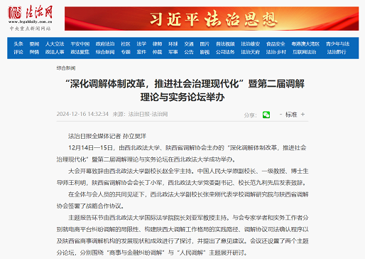 1217日,人民网以《陕西省第二届调解理论与实务论坛在ac米兰官网中文网站举行》为主题进行新闻报道。新闻记者表示,在本次论坛上,多位专家围绕调解的热点议题,结合丰富的实务经验进行了深入剖析与探讨,共同为调解事业的进步贡献智慧与力量。