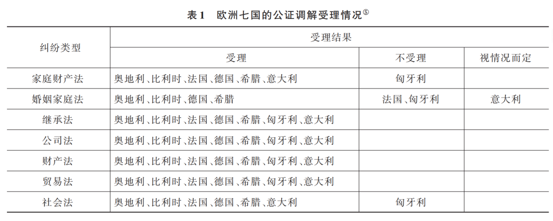 1.以“一般涵盖+重点突出+负面清单”模式厘定调解范围。《司助试点工作通知》将公证参与先行调解的案件范围界定为“家事、商事等领域”,其范围设定狭窄模糊且多为调解实践所逾越,是否将其作为适用于其他调解模式的公证调解范围存在疑问。公证调解范围应当遵循“一般涵盖+重点突出+负面清单”的基本思路予以厘定。首先,公证调解是面向全体公众提供的普适性法律服务,基于公证调解员的法律专业性,不同类型、不同复杂程度的纠纷其均可处理。因此,公证调解范围原则上不应设限,凡当事人达成调解意愿并向公证机构申请调解的纠纷,均在公证机构受理范围之内。其次,公证调解范围尽管应涵盖一般性纠纷,但同时应将体现法律评价专业优势的纠纷类型纳入重点受理范围。从比较法视角观察,继承纠纷、公司纠纷、财产纠纷与贸易纠纷被欧洲多国纳入公证调解范围(见表1),理由在于以上纠纷与法定公证事项相关,公证人较为熟悉,其中遗产纠纷被部分学者认为是最适宜由公证人处理的纠纷类型。借鉴国外经验,我国可将与日常公证证明业务相关的纠纷类型作为体现公证调解比较优势的调解事项。因此,公证调解的重点范围应当视各地公证机构的业务开展特点而定,对于其中调解效果良好且具有普适性的纠纷类型,可以考虑设置强制公证调解的诉讼前置程序。最后,应当设立公证调解范围的负面清单,避免制度功能减损。负面清单的设置可以考虑以下三个方面:一是排除不适宜调解的案件;二是注意参与调解模式中法规范对于调解事项的排除性规定;三是公证机构的自身规模与专业性水平是否适宜主导纠纷调解活动。
