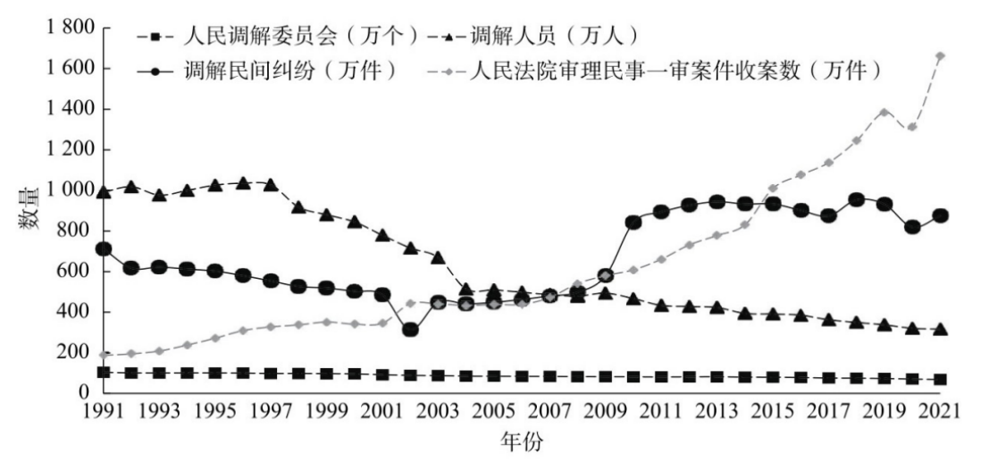 图11991—2021年人民调解以及法院一审民事案件的变化情况