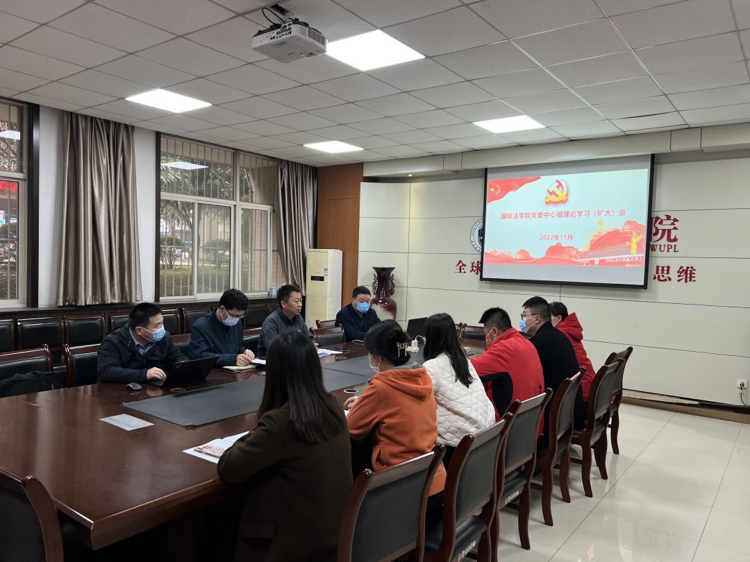 为全面学习、全面把握、全面落实中国共产党第二十次全国代表大会精神,11月2日下午,国际法学院党委于格物楼一层会议室通过线上线下相结合的方式召开理论学习中心组(扩大)会议,院党委理论学习中心组全体成员、各党支部书记、全体科级干部及学工干部参加学习。学院党委书记李立主持会议。