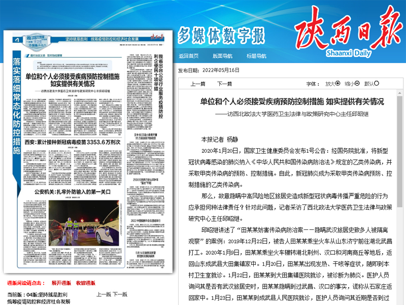 此外,邱昭继还向公众梳理了相关的法律知识点:《传染病防治法》第十二条规定,在中华人民共和国领域内的一切单位和个人,必须接受疾病预防控制机构、医疗机构有关传染病的调查、检验、采集样本、隔离治疗等预防、控制措施,如实提供有关情况。