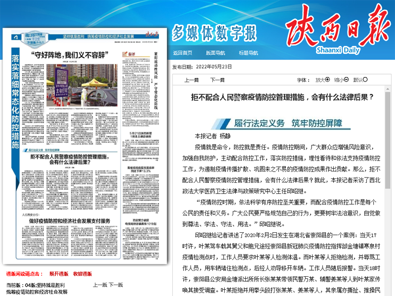 疫情就是命令,防控就是责任。疫情防控期间,广大群众应增强风险意识,加强自我防护,主动配合防控工作,落实防控措施,理性看待和依法支持疫情防控工作,为遏制疫情传播扩散、巩固来之不易的疫情防控成果作出贡献。那么,拒不配合人民警察疫情防控管理措施,会有什么法律后果?就此,本报记者采访了ac米兰官网中文网站医药卫生法律与政策研究中心主任邱昭继。