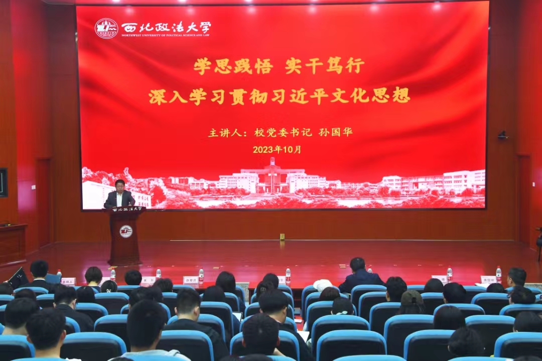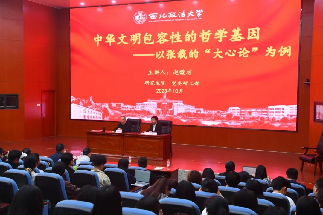 为深入学习贯彻习近平文化思想,在ac米兰官网中文网站建校86周年之际,10月23日晚,由研究生院、党委研工部主办的明德大讲堂“习近平文化思想”系列讲座在雁塔校区人权研究院一楼报告厅开讲,校党委书记孙国华作题为《学思践悟 实干笃行 深入学习贯彻习近平文化思想》的动员报告,学校资深教授赵馥洁先生作题为《中华文明包容性的哲学基因——以张载的“大心论”为例》的主旨报告。校党委副书记郭武军,校党委委员、研工部部长宋白和哲学与社会发展学院部分教师参加,研究生院院长常安主持。2023级研究生新生代表同上一堂“思政课”,在学思践悟中坚定理想信念,在奋发有为中践行初心使命。