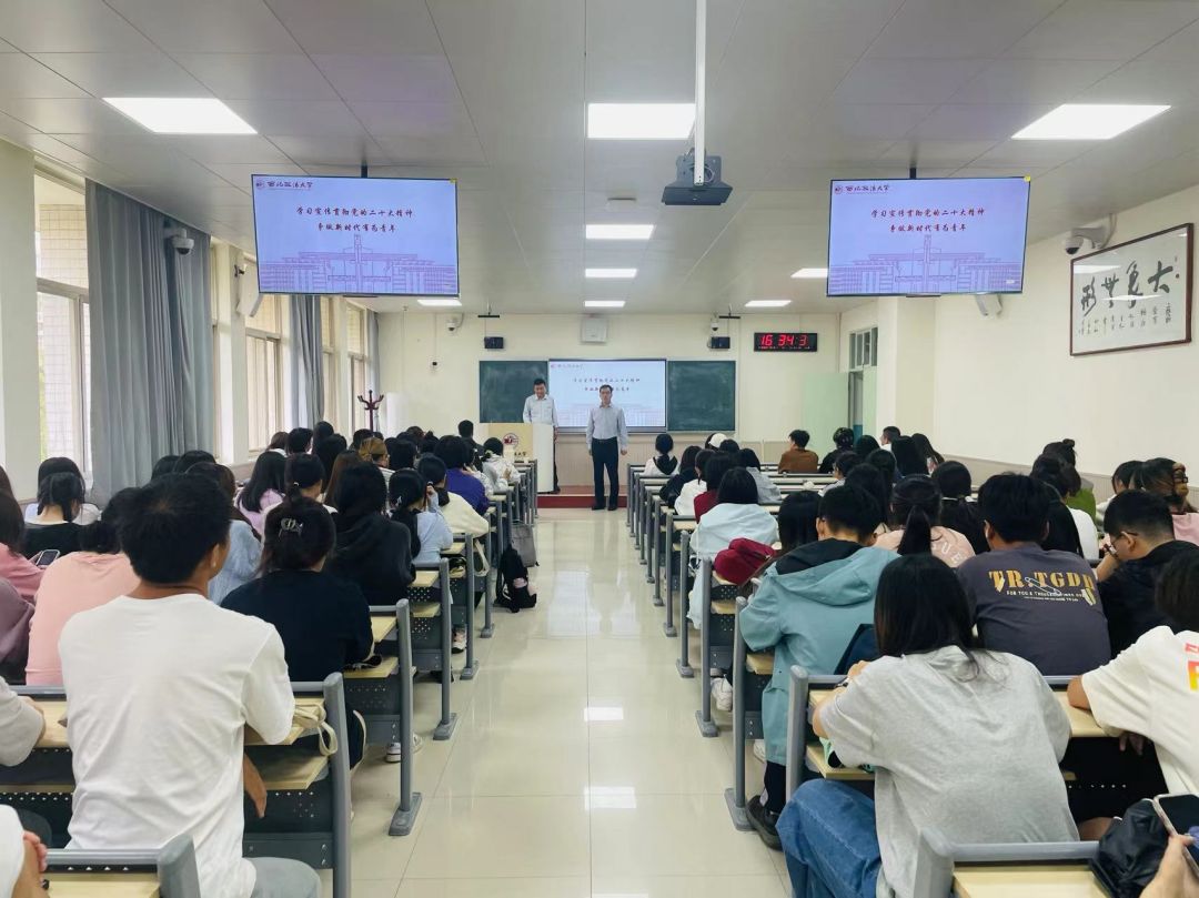 5月24日下午,校党委副书记郭武军以“学习宣传贯彻党的二十大精神,争做新时代有为青年”为主题,在长安校区致知楼为外国语学院120余名本科生讲授专题思政课。
